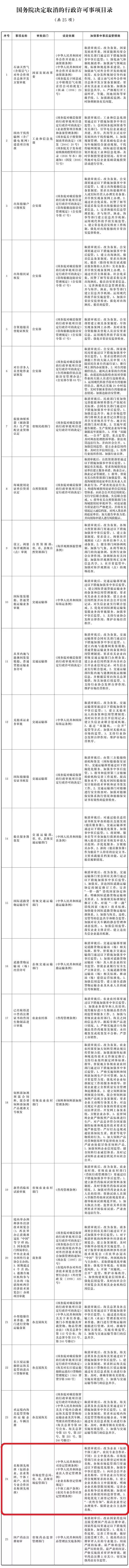 经研究论证,国务院决定取消25项行政许可事项,下放6项行政许可事项的管理层级,现予公布。另有5项依据有关法律设定的行政许可事项,国务院将依照法定程序提请全国人民代表大会常务委员会修订相关法律规定。