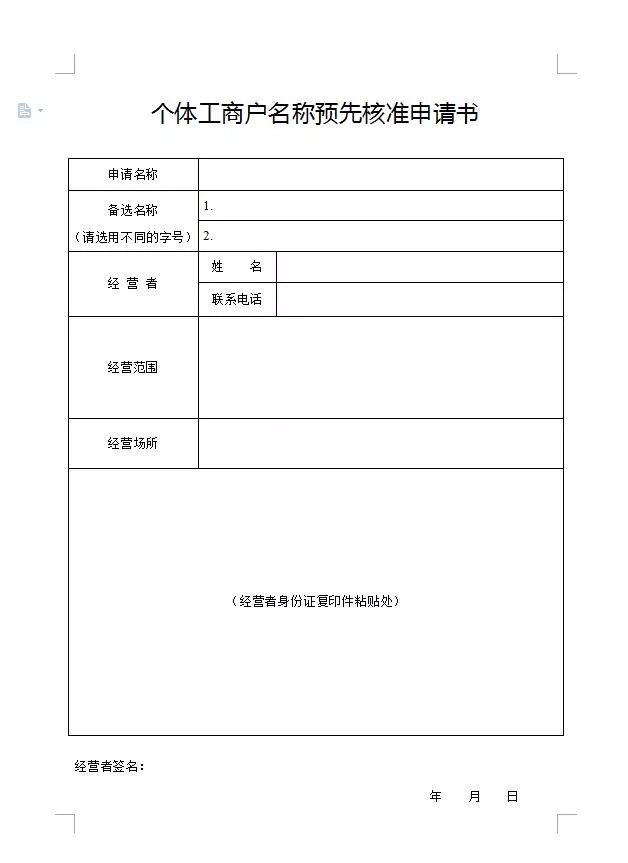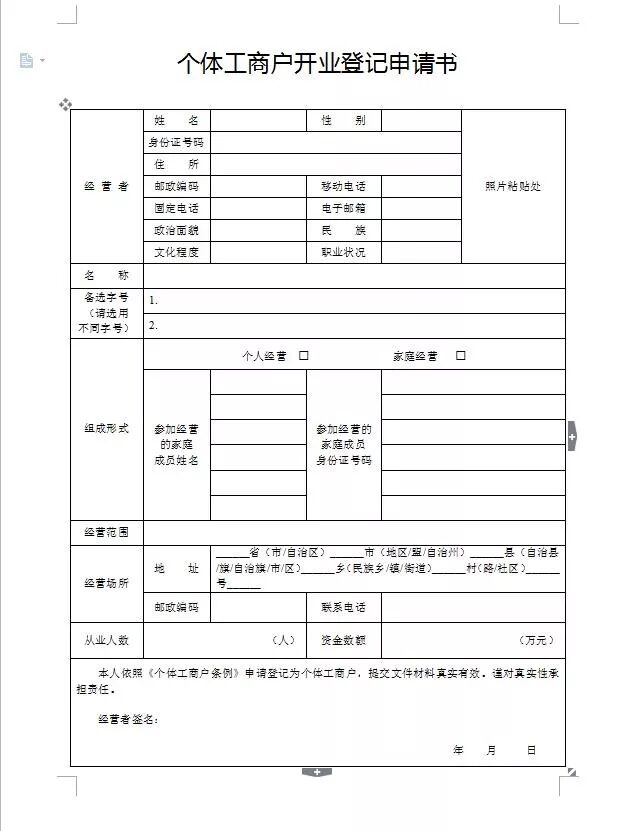 2.经营者的身份遂宁代办执照证复印件;申请登记为家庭经营的,以主持经营者作为经营者登记,由全体参加经营家庭成员在《个体工商户开业登记申请书》经营者签名栏中签字予以确认。提交居民户口簿或者结婚证复印件作为家庭成员亲属关系证明;同时提交其他参加经营家庭成员的身份证复印件,对其姓名及身份证号码予以备案。