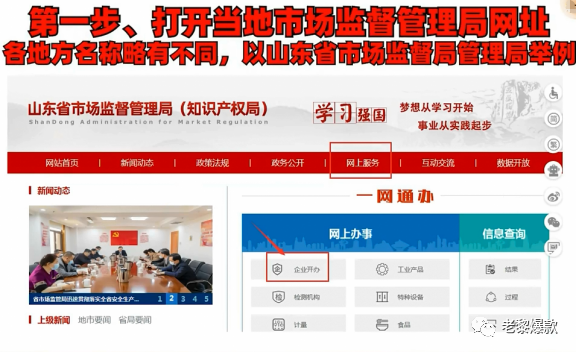第一步打开当地市场监督管理局网址,首页就有企业开办选项,有的地方网站首页没有的话可以点击网上服务。
