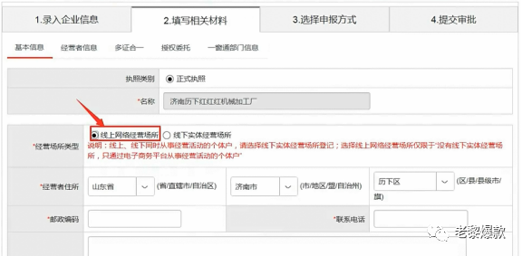 第六步,完成后点击发起设立,选择线上网络经营场所,地址就是自己淘宝店铺链接,选择申报方式为全程电子化登记。