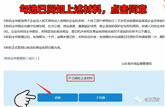 第三步登录进入,选择名称自主申报,勾选以阅之上述材料,点击同意。遂宁代办注册公司