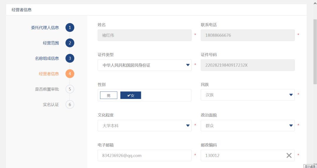 点击“确定”按钮,页面返回到经营者信息页面,如下图: