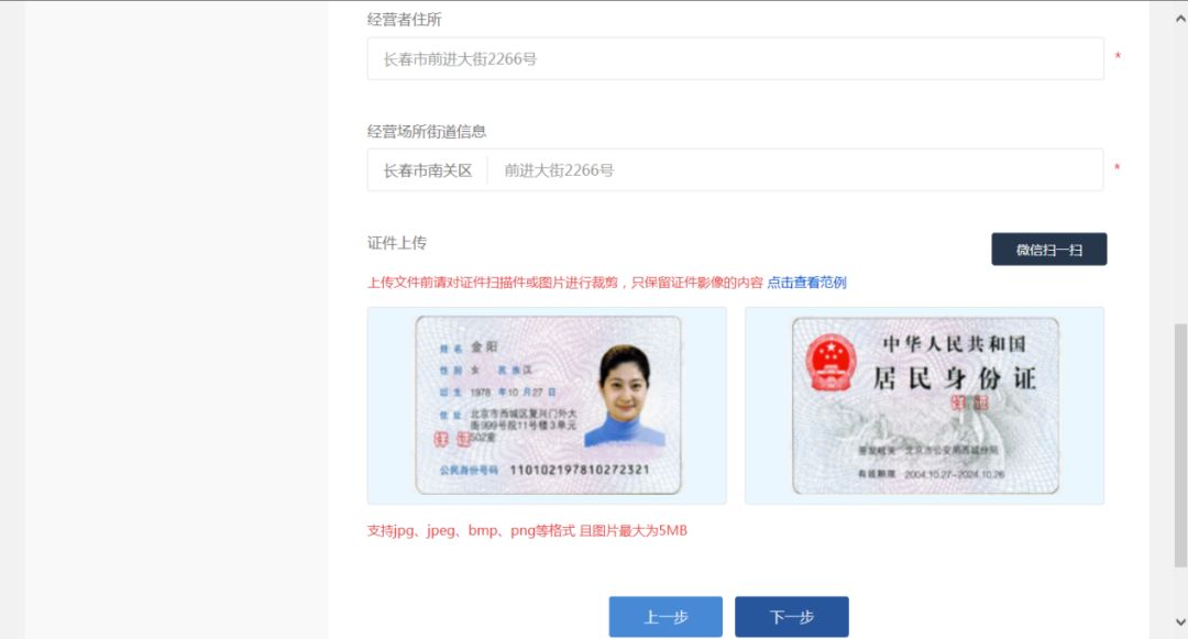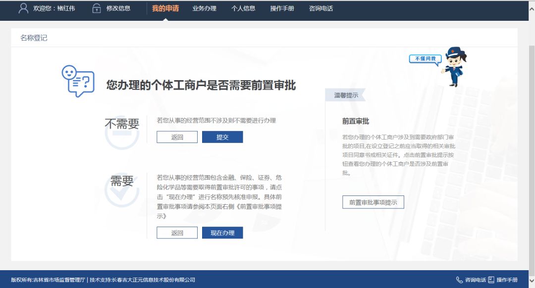 用户根据实际情况填写相关信息,并且上传身份证正反面相片,点击“下一步”按钮,系统自动流转到“您办理的个体工商户是否需要前置审批”页面,如下图: