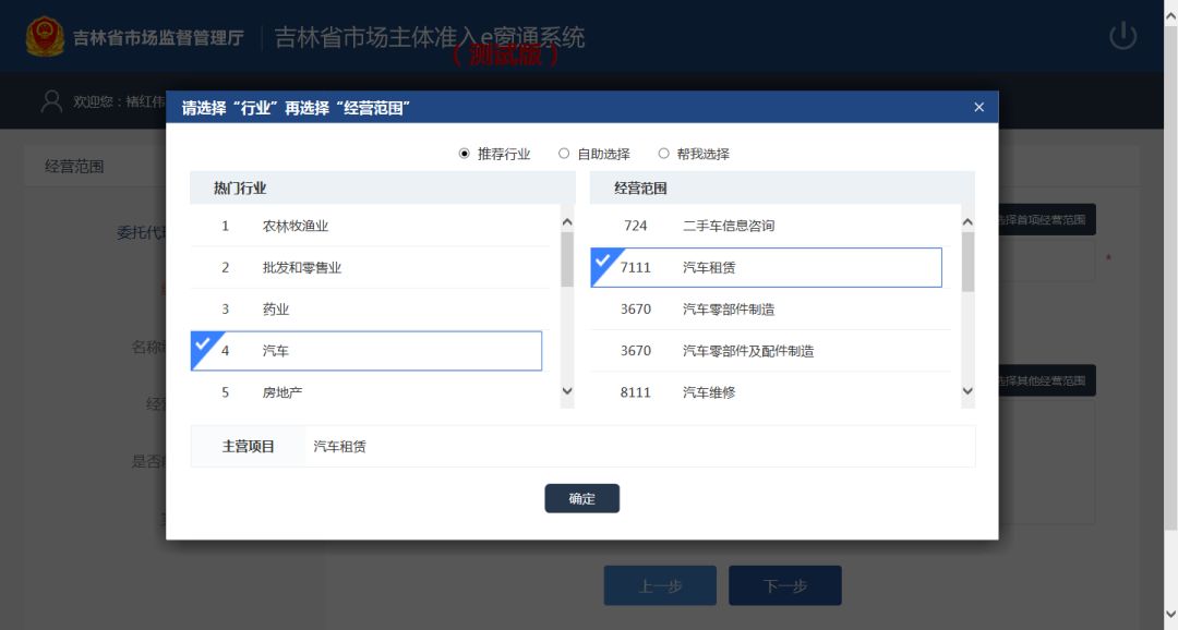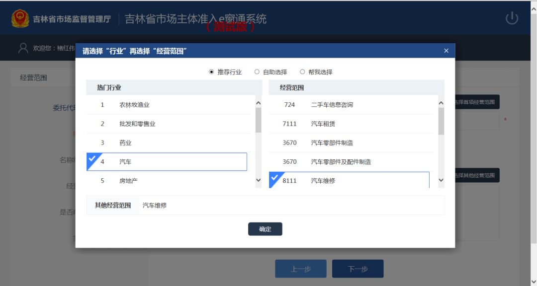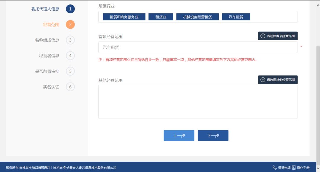 点击 “请选择首项经营范围”选择经营范围系统跳转到行业选择页面。