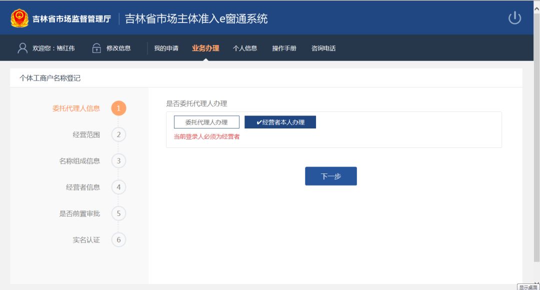 用户点击“经营者本人”图标,然后点击“下一步”按钮,遂宁代办注册公司进入到下一系统页面。