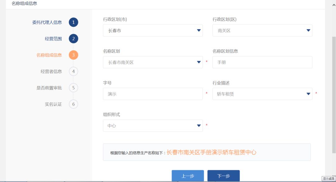 选择行业后,系统自动带入行业相关遂宁代办注册公司的经营范围,用户可以根据自己实际情况编辑经营范围。点击“下一步”提交操作,系统跳转到名称组成信息页面。如下图: