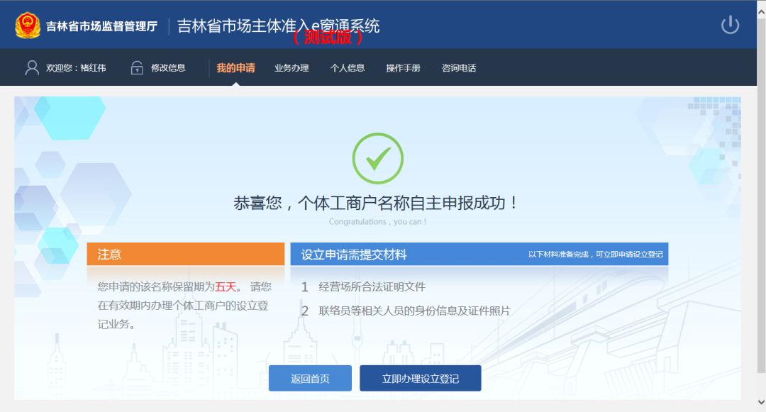 用户仔细阅读信息内容,点击“同意”按钮,页面跳转到“恭喜您,个体工商户名称自主申报成功”页面,如下图: