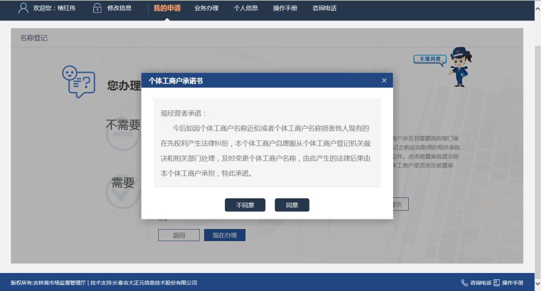 用户仔细核对信息后,点击“确定”按钮,页面流转到个体工商户承诺书页面,如下图: